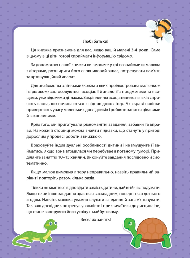 Книжка серії «Вчимося граючи» познайомить малечу з літерами за допомогою улюбленої справи — приклеювання наліпок. Виконавши завдання, дітлахи вивчать літеру. До того ж розширять словниковий запас та потренують артикуляційний апарат і пам’ять, промовляючи віршики й скоромовки. А ще спробують прочитати перші склади! Поради для батьків підкажуть, як маленьким непосидам закріпити знання. Запрошуємо до занять!