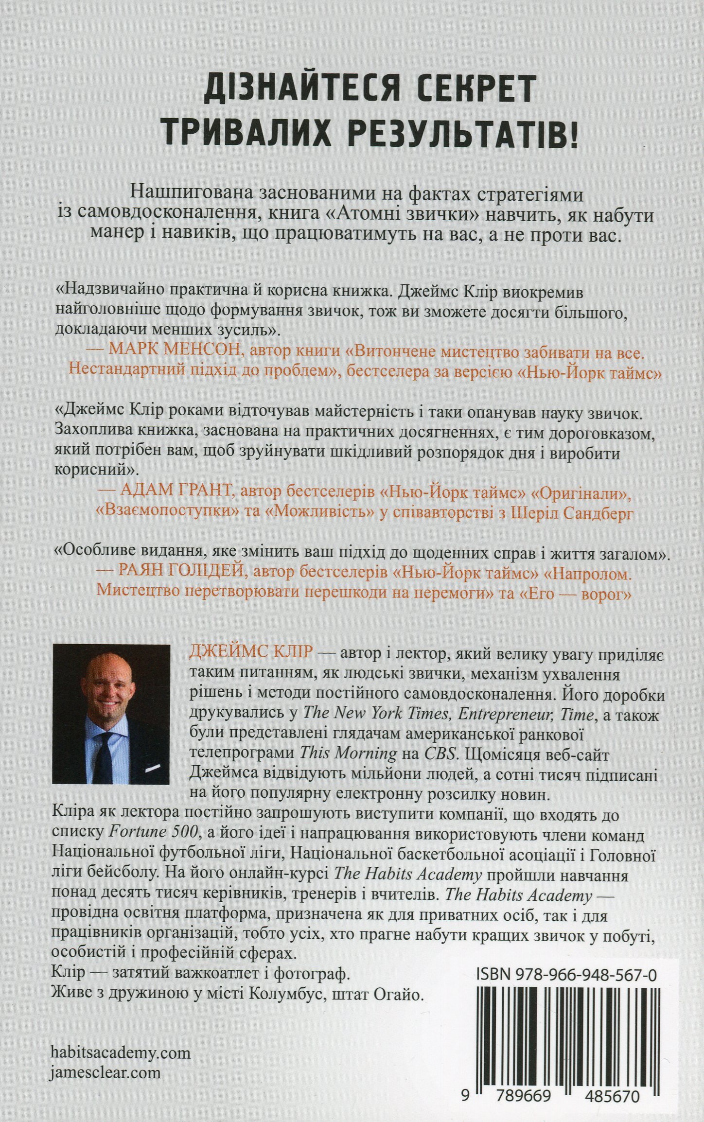 Джеймс Клір — автор і лектор, який велику увагу приділяє таким питанням, як людські звички, механізм ухвалення рішень і методи постійного самовдосконалення. Його доробки друкувались у The New York Times, Entrepreneur, Time, а також були представлені глядачі американської ранкової телепрограми This Morning на CBS. Щомісяця веб-сайт Джеймса відвідують мільйони людей, а сотні тисяч підписані на його популярну електронну розсилку новин. Кліра як лектора постійно запрошують виступити компанії, що входять до списку Fortune 500, а його ідеї і напрацювання використовують члени команд Національної футбольної ліги, Національної баскетбольної асоціації і Головної ліги бейсболу.