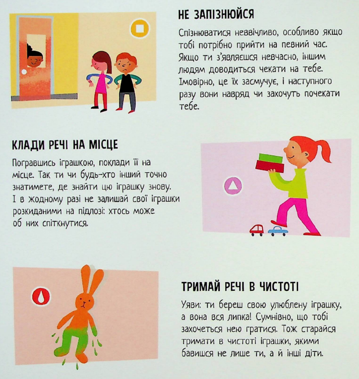 Маленький читач, розглядаючи різноманітні ситуації, дізнається, чого ніколи не слід робити, і головне — чому хороші манери корисні для всіх.