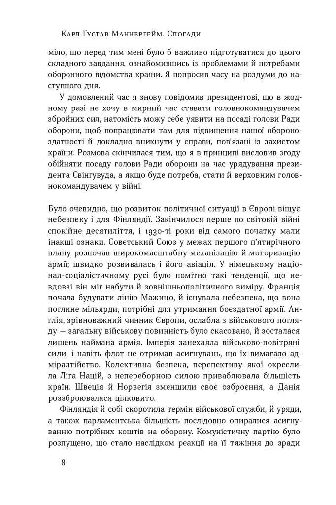 У своїх спогадах Маннергейм розкриває багато деталей радянсько-фінляндської та Другої світової воєн. Як країні з чотиримільйонним населенням удавалося протистояти демографічному велетневі — СРСР? На які жертви Фінляндія йшла заради миру? Наскільки лицемірно поводилися радянські представники на перемовинах? Як Фінляндія протистояла тиску Третього Райху, що вимагав приєднатися до наступу на Ленінград? Відповіді на ці й інші питання ви отримаєте з першоджерела — спогадів батька сучасної Фінляндії. А ще зрозумієте, наскільки мудрим, чуйним і скромним він був.