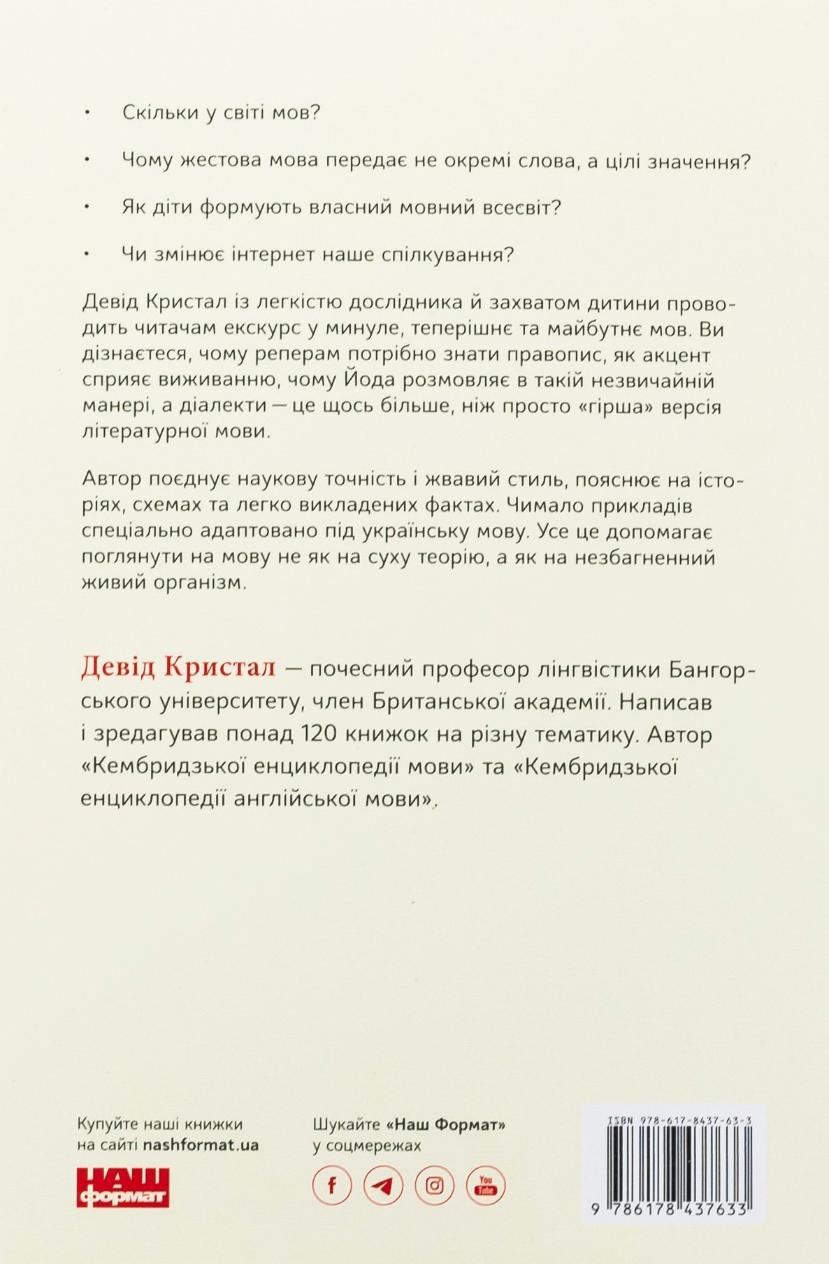 Девід Кристал із легкістю дослідника й захватом дитини проводить читачам екскурс у минуле, теперішнє та майбутнє мов. Ви дізнаєтеся, чому реперам потрібно знати правопис, як акцент сприяє виживанню, чому Йода розмовляє в такій незвичайній манері, а діалекти — це щось більше, ніж просто «гірша» версія літературної мови.
