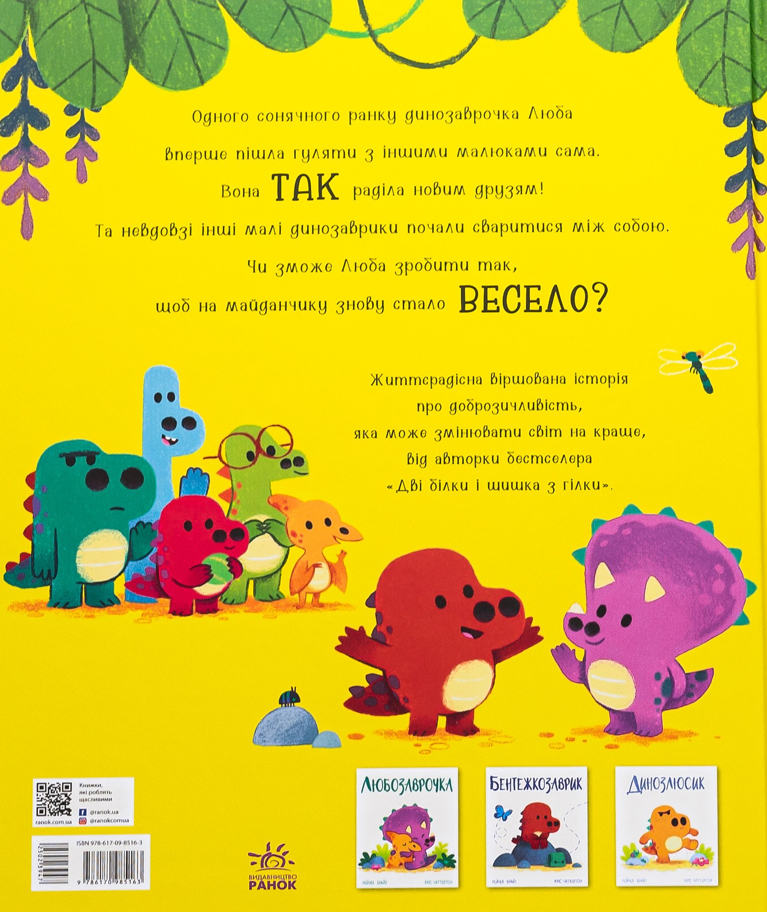 Одного сонячного ранку динозаврочка Люба вперше пішла гуляти з іншими малюками сама. Вона так раділа новим друзям! Та невдовзі інші малі динозаврики почали сваритися між собою. Чи зможе Люба зробити так, щоб на майданчику знову стало весело? Життєрадісна віршована історія про доброзичливість, яка може змінювати світ на краще.