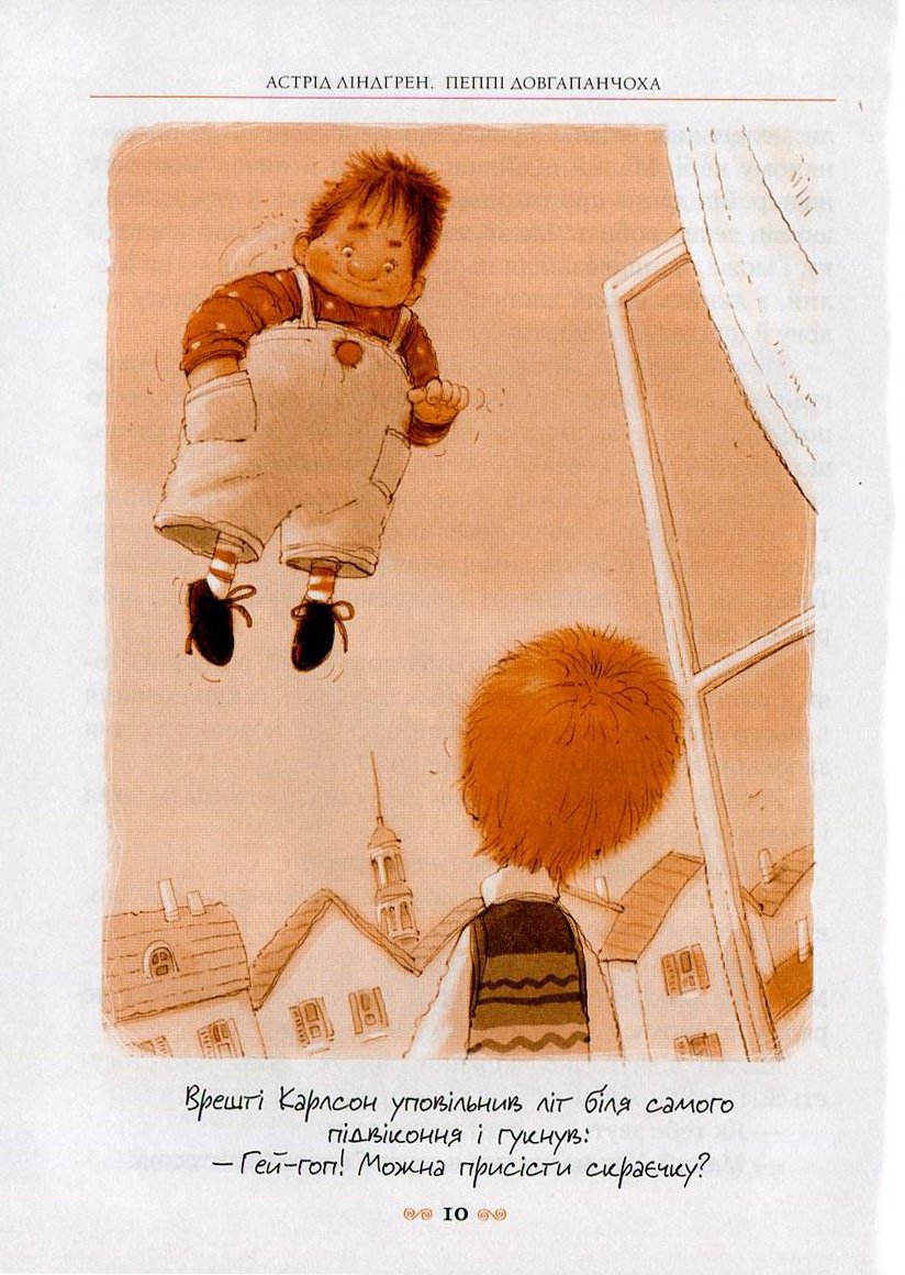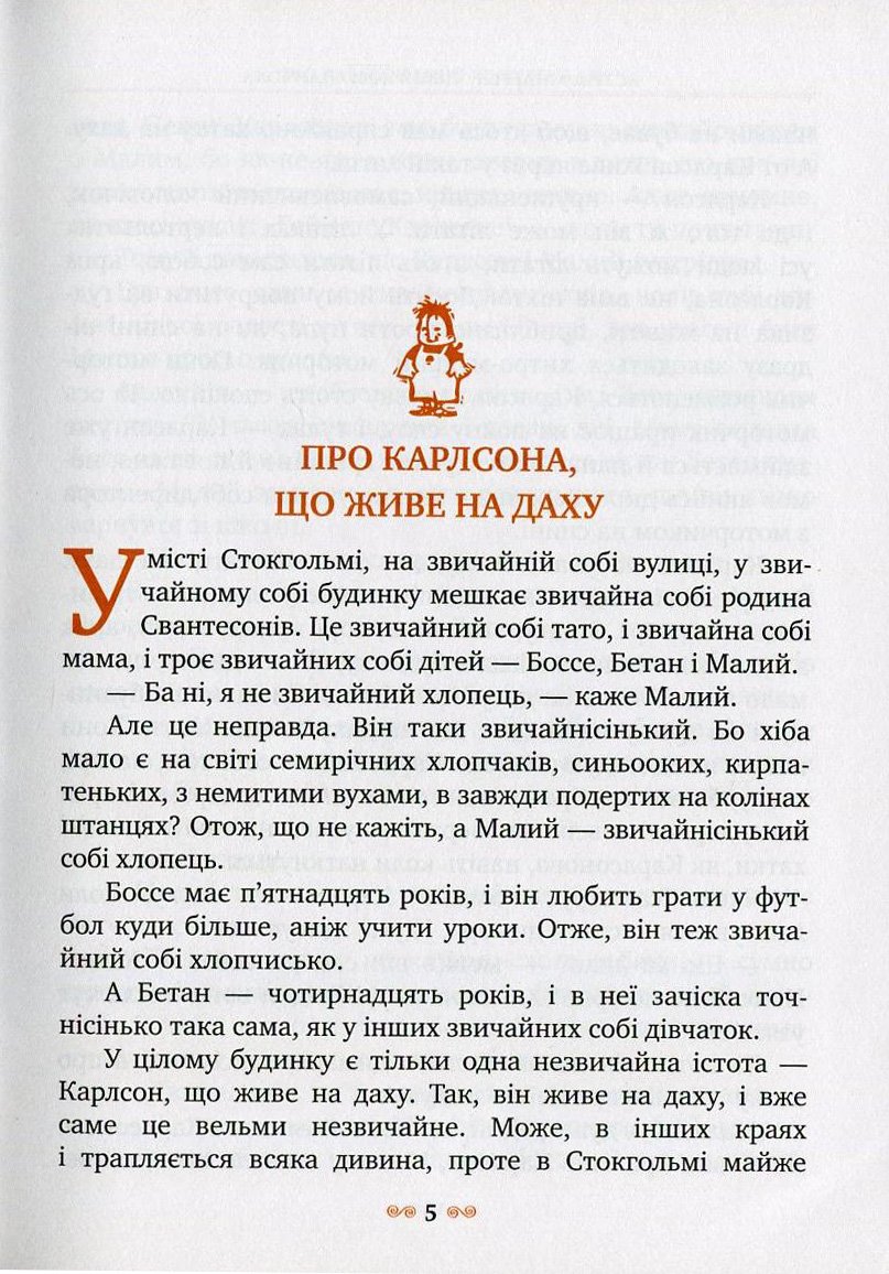 “У місті Стокгольмі…” – з цієї фрази розпочинається дивовижна повість, яка полюбилася малятам усього світу і, як не дивно, їхнім батькам. Так от, живе в цьому північномі місті, у звичайному будинку, звичайнісінький Малий, а на даху будинку мешкає незвичайна істота – Карлсон, який має моторчик і вміє літати. Живуть вони, потрапляючи в неймовірні пригоди, від 1955 р., коли було написано першу книжку. Тепер зрозуміло, чому Карлсона знають і більшість батьків малюків. Разом із рідними юні читачі зануряться в цей фантастичний світ, аби на одному подиху прочитати про пригоди цих цікавих героїв. Чудові ілюстрації Арсена Джанік’яна до книжки, перекладеної зі шведської Ольгою Сенюк, зроблять це читання незабутнім.