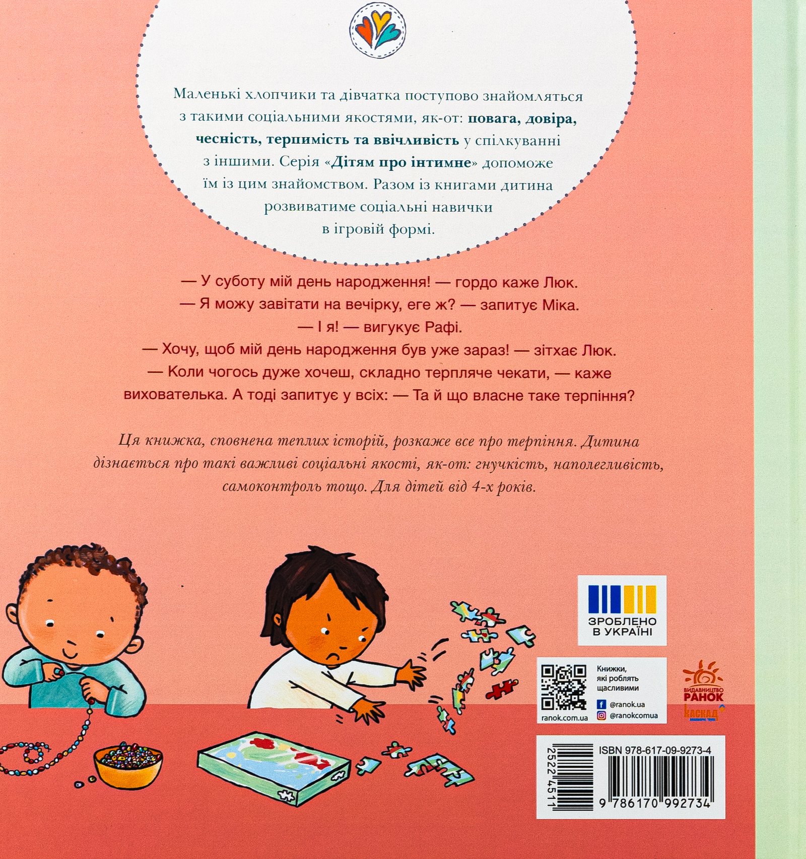 Це унікальне видання допоможе дитині зрозуміти й опанувати терпіння — якість, яка допомагає долати труднощі й досягати успіхів.