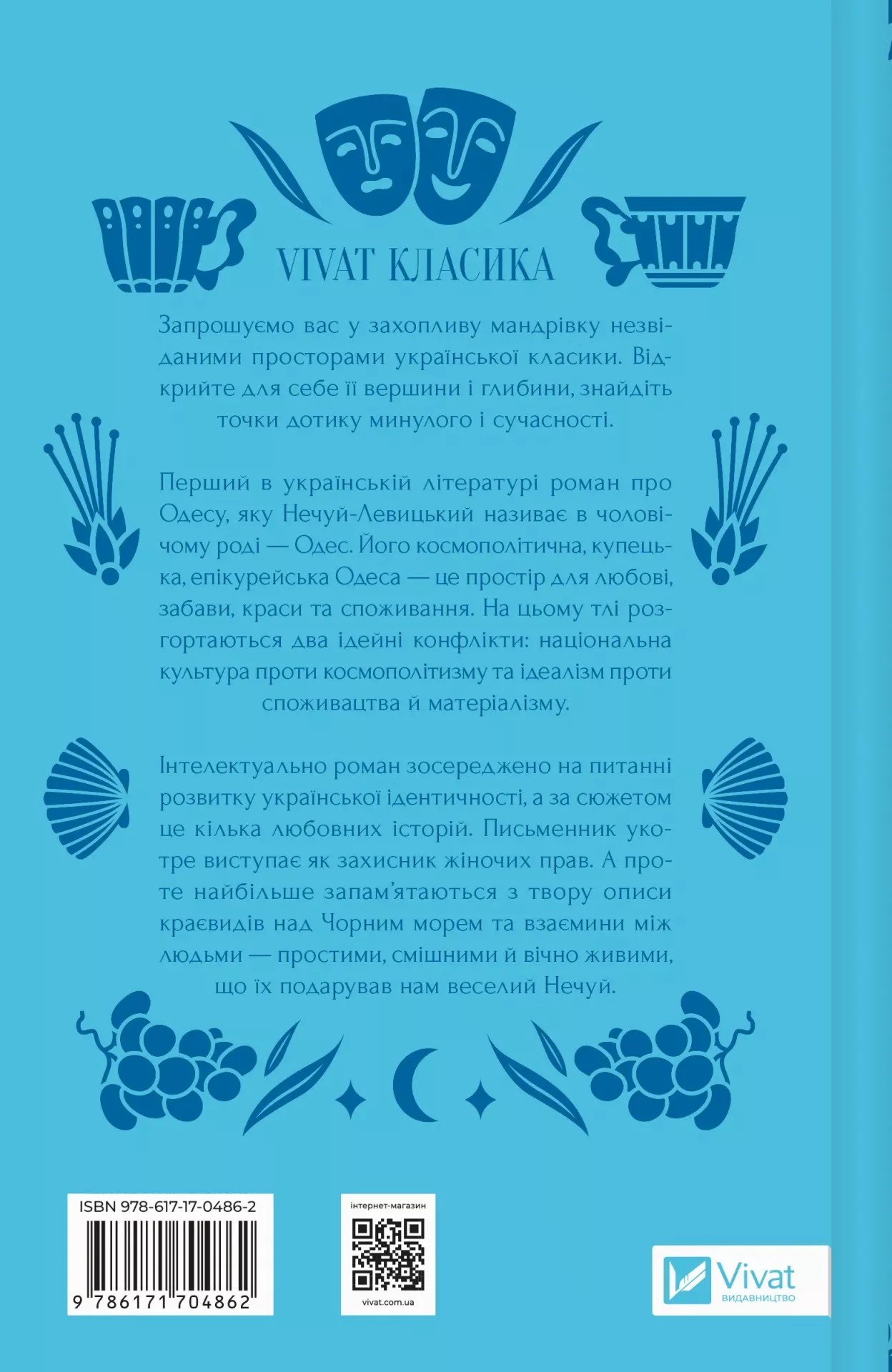 Перший в українській літературі роман про Одесу, яку Нечуй-Левицький називає в чоловічому роді — Одес. Його космополітична, купецька, епікурейська Одеса — це простір для любові, забави, краси та споживання. На цьому тлі розгортаються два ідейні конфлікти: національна культура проти космополітизму та ідеалізм проти споживацтва й матеріалізму.