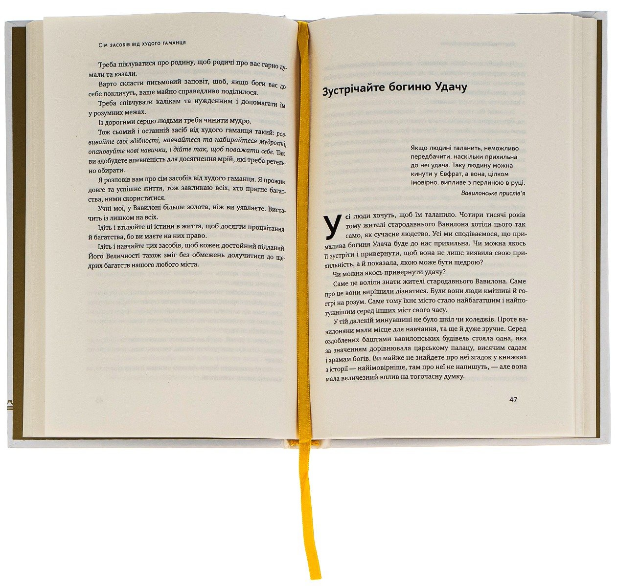 Клейсон надає важливе значення силі волі та відданості меті. Він закликає намагатися заощаджувати за будь-яких умов, контролювати витрати та інвестувати в себе, щоб вдосконалити вміння заробляти. Кожна притча завершується висновком, що спонукає до роздумів. А відсилання до епохи Вавилона натякає, що ази фінансової грамотності незмінні тисячоліттями та що в будь-які часи все може стати краще за наявності бажання, стійкості й рішучості. Ця книга може бути відправною точкою для вивчення основних компонентів особистих фінансів, таких як заощадження та інвестиції, або ж нагадуванням про принципи економії й здорові стосунки з грошима, якщо ви вже знайомі з базою.