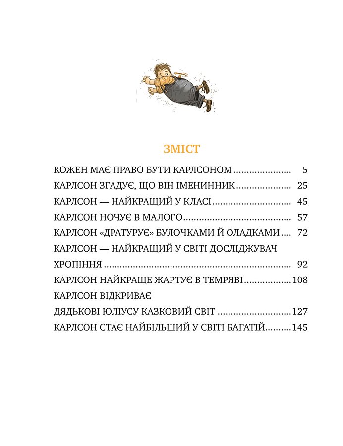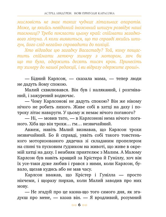 «Нові пригоди Карлсона, що живе на даху» — так називається третя книжка про твоїх улюблених героїв, написана через 13 років (1968) після першої. Що не сторінка — то нові оказії. Тож не барися, поринай у читання.