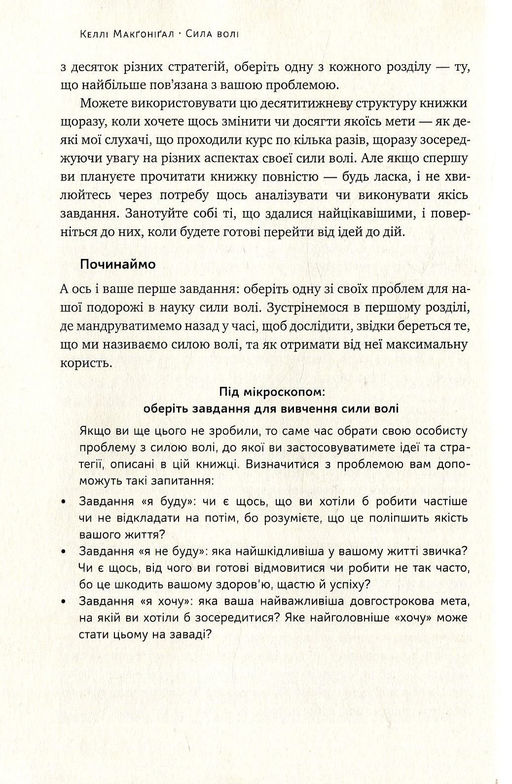 «Якщо ми намагаємося зберегти енергію, відлежуючи боки на дивані, то можемо втратити й ту дещицю сили, що в нас є. Однак і щоденні марафони для сили волі призведуть лише до цілковитого краху. Тренуватися потрібно, наче мудрий спортсмен, — розширюючи межі обережно і поступово».