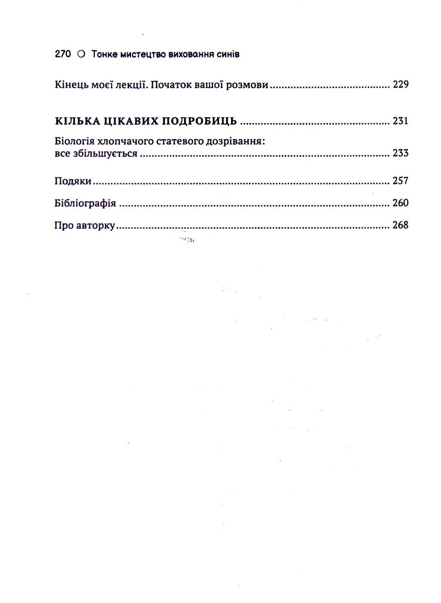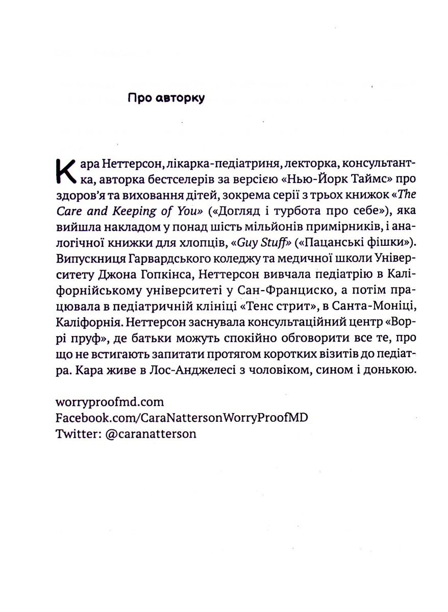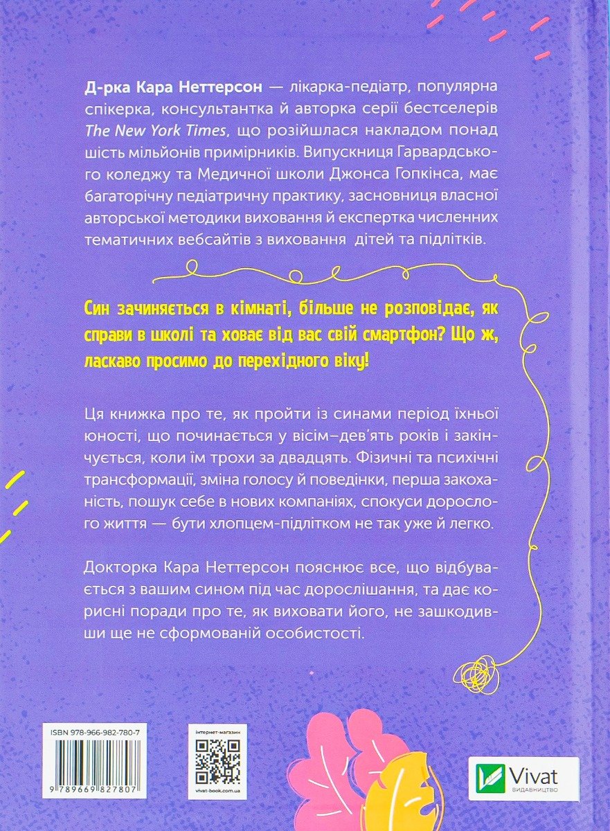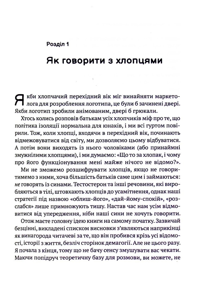 Ця книжка про те, як пройти із синами період їхньої юності, що починається у вісім–дев’ять років і закінчується, коли їм трохи за двадцять. Докторка Кара Неттерсон пояснює все, що відбувається з вашим сином під час дорослішання. Фізичні та психічні трансформації, зміна голосу й поведінки, перша закоханість, важливість соціалізації та пошук себе в нових компаніях, спокуси дорослого життя — бути хлопцем-підлітком не так уже й легко. Виховати сина, яким ви пишатиметеся, не зашкодивши його ще не сформованій особистості, — дійсно тонке мистецтво, як і розуміння того, що відбувається з нашими хлопцями, коли ми виховуємо їх.