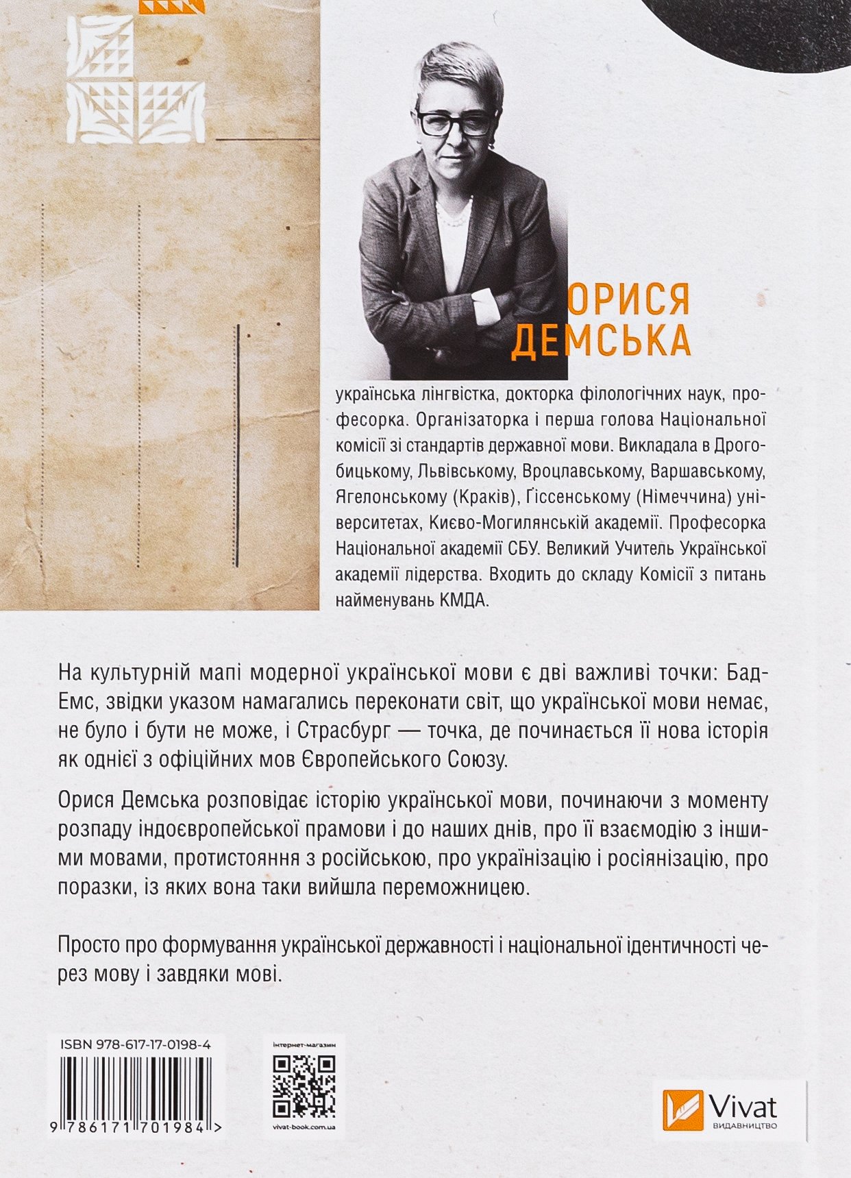 Орися Демська розповідає про зародження й розвиток української мови від індоєвропейської прамови до наших днів, її взаємодію з іншими мовами, історію взаємозбагачень, непримириме протистояння з російською і перебіг лінгвоцидів, із яких вона все ж таки вийшла переможницею.
