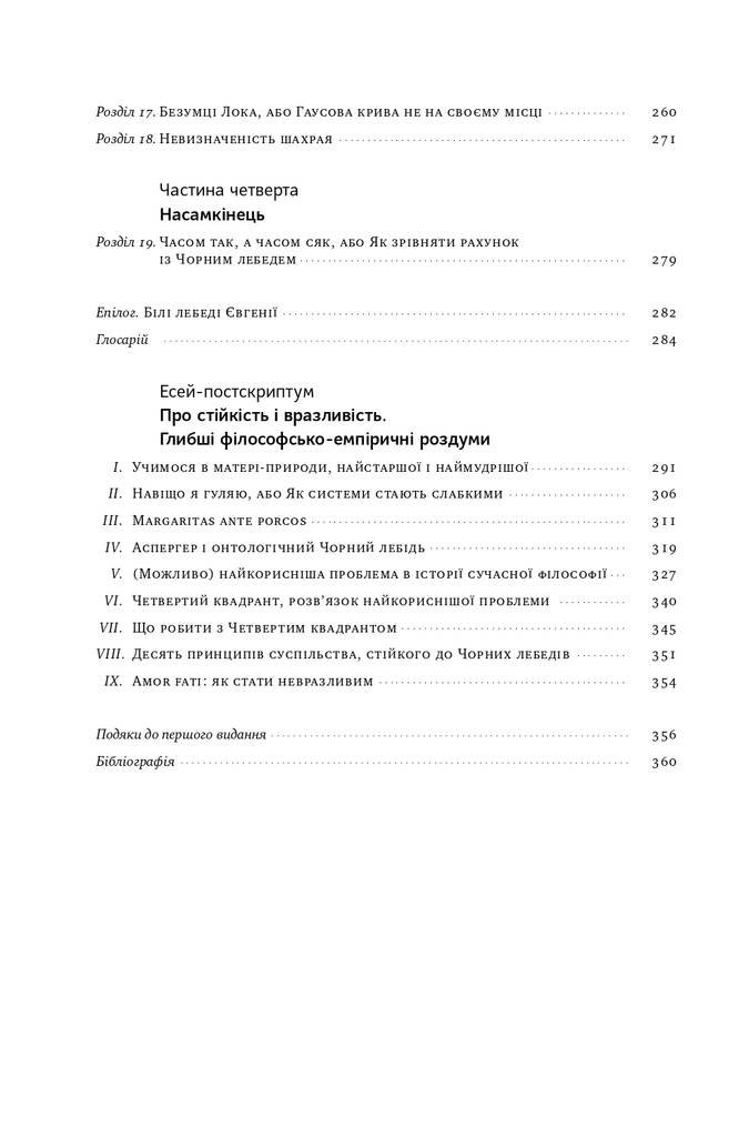 Це — «чорні лебеді», рідкісні події, які неможливо передбачити. Насім Талеб у своїй книзі досліджує не лише теорію вірогідності виникнення цих подій, а й їхній вплив на історію людства. Талеб аналізує те, як ми пояснюємо «чорних лебедів», як шукаємо у них закономірності і як це впливає на нас у загальнолюдському та індивідуальному масштабах.